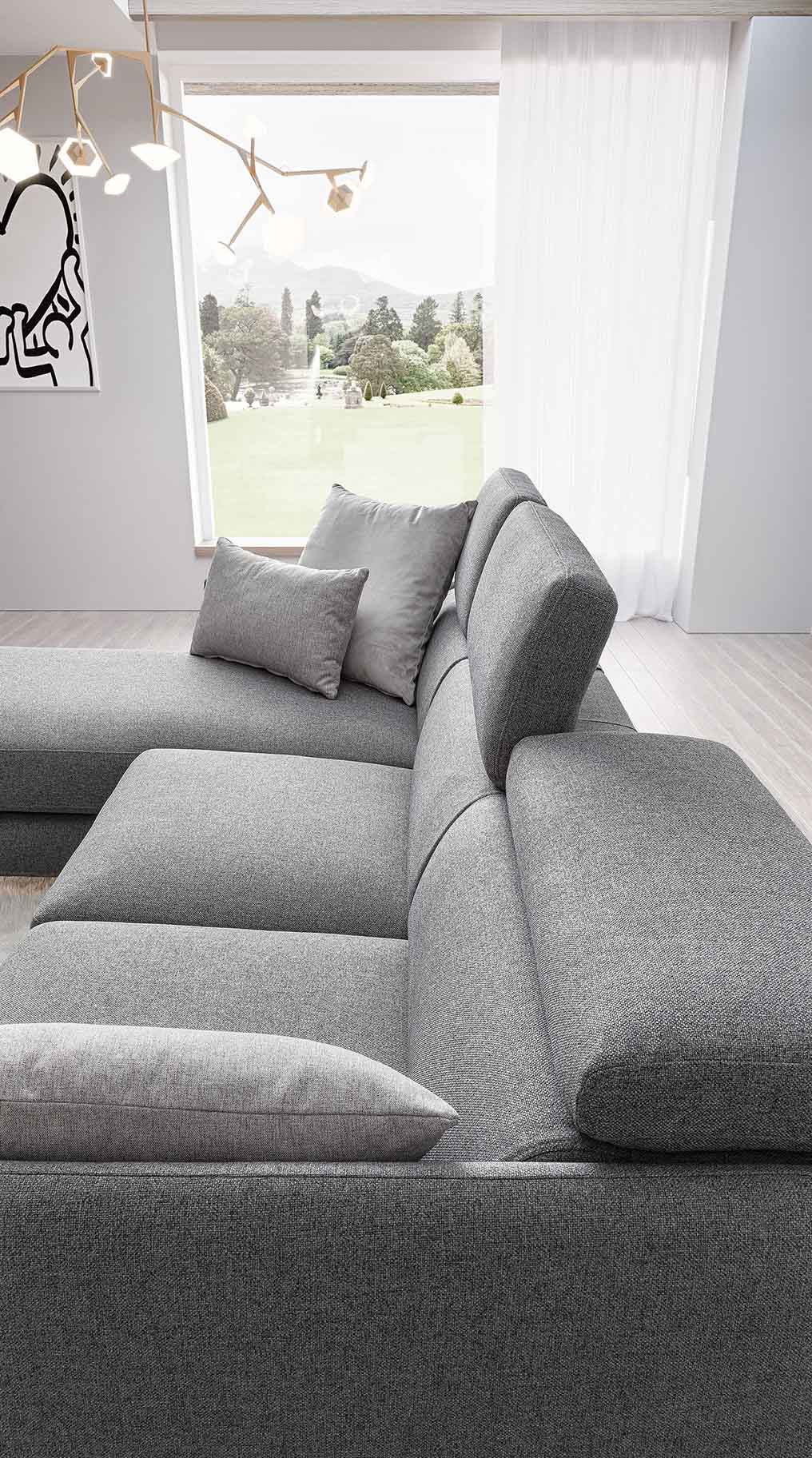Divano moderno con poggiatesta regolabili e seduta angolare asimmetrica.